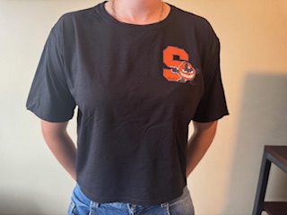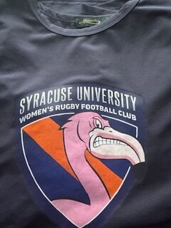 Dry-fit training top with large SUWRFC Flamingo Crest. Available in navy blue. Women’s fit.